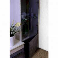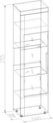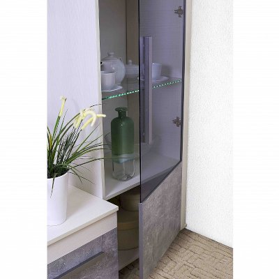 Посудный шкаф со стеклянной дверцей позволит выставить в гостиной те коллекционные и памятные вещицы, которыми вы дорожите. Стеклополки в обработке еврокромкой выдерживают до 10 кг каждая. Их можно декоративно подсветить с помощью светодиодной подсветки (в комплекте не поставляется, приобретается отдельно). Фасад перенавешивается на левую и правую сторону. Серебристая стильная ручка из массива дерева и серое тонирование стекло фасада вносят смелые дизайнерские штрихи в восприятии актуального декора "под бетон".
