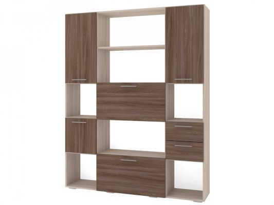 Применение задней стенки из ЛДСП (в ячейках с ящиками и фасадами) позволяет использовать данный стеллаж для зонирования пространства (чтобы предотвратить опрокидывание, необходимо обеспечить крепление стеллажа к стене).