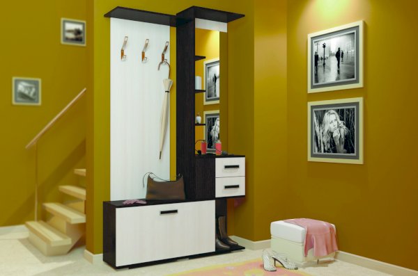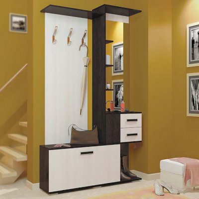 Состоит из полки с крючками, тумбы.
